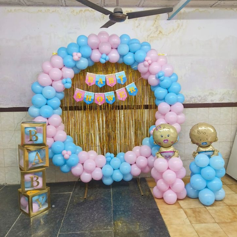 Celebrate your special moment with this charming Baby Shower Ring Balloon Decoration designed in a classic pink and blue theme. The setup features a round balloon ring decorated with pastel balloons, a shiny gold fringe curtain backdrop, and a colorful “Baby Shower” banner. Cute baby boy and baby girl cutout balloons along with stacked BABY letter boxes enhance the overall look and make the decoration more joyful.