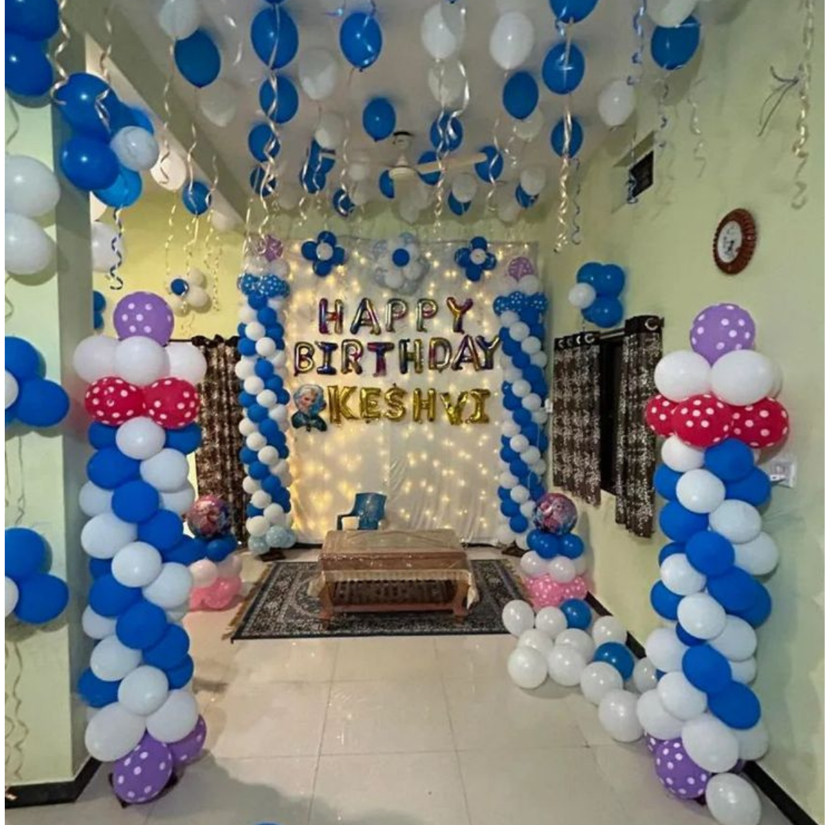 A vibrant Blue & White Birthday Decoration featuring balloon pillars, ceiling balloons with ribbons, LED fairy light backdrop, foil letters, and cartoon theme add-ons. Perfect for kids’ birthdays, home celebrations, and themed parties.