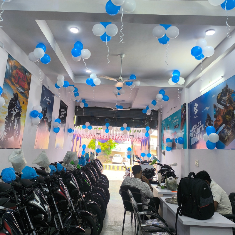 corporate event decoration, showroom opening decoration, balloon decoration for showroom, corporate balloon decoration, bajaj showroom decoration, bike showroom inauguration decor, corporate event planner gwalior, jmd events gwalior, showroom launch decoration, office opening balloon decor, blue white balloon decoration, professional event decoration, corporate branding decor, outlet opening decoration, showroom entrance decoration, balloon decoration gwalior, corporate decoration services, business launch decoration, motor showroom decoration, event management company gwalior