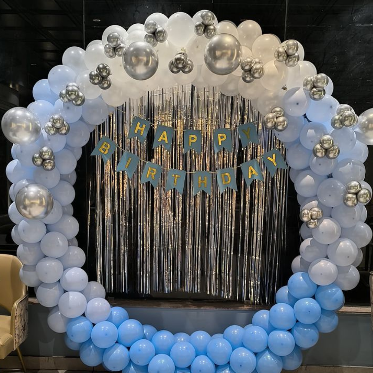 birthday balloon decoration, balloon arch decoration, happy birthday backdrop, birthday party decor, elegant birthday decoration, blue and white balloon decoration, silver balloon decoration, chrome balloon decor, balloon ring decoration, balloon circle backdrop, birthday backdrop decoration, foil curtain backdrop, shimmer curtain decoration, birthday stage decoration, indoor birthday decoration, birthday wall decoration, modern birthday decor, classy birthday decoration, luxury birthday decoration, simple birthday decoration, kids birthday decoration, boys birthday theme decoration, girls birthday decor, adult birthday decoration, pastel balloon decoration, balloon garland decoration, balloon arch for birthday, birthday photo backdrop, birthday photo booth decoration, aesthetic birthday decor, Instagram birthday backdrop, party decoration ideas, birthday celebration decoration, event decoration services, birthday decor setup, professional balloon decoration, balloon styling for birthday, birthday party supplies, birthday decoration ideas at home, themed birthday decoration, minimalist birthday decor, balloon decoration near me, birthday hall decoration, birthday event planner, balloon and foil backdrop, elegant party backdrop, birthday decor inspiration