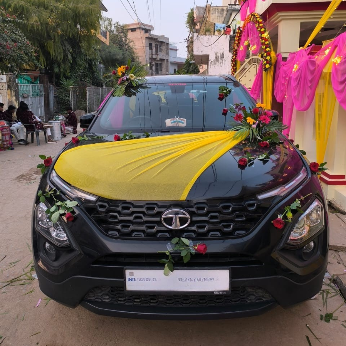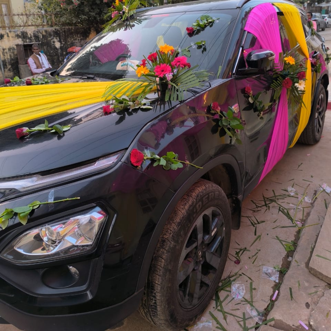 Make your special day unforgettable with this elegant wedding car decoration featuring vibrant yellow and pink drapes and fresh red roses. Beautifully arranged floral accents on the bonnet and mirrors create a classy and festive look, perfect for weddings, engagements, and special celebrations. 🌸✨