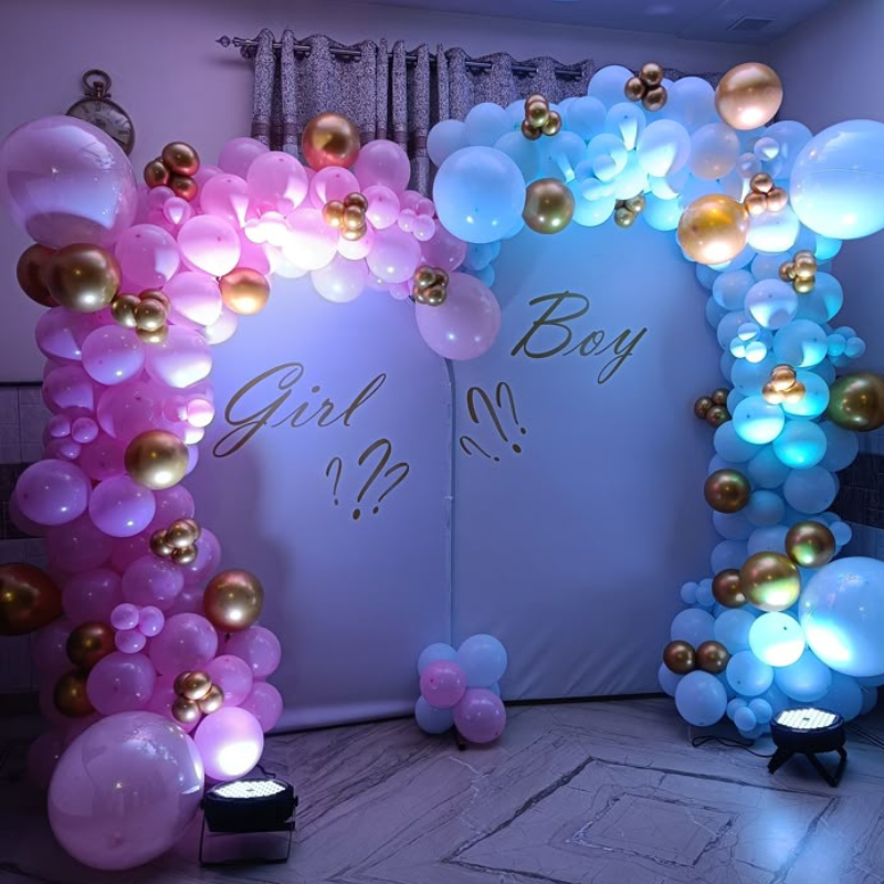 boy or girl decoration, gender reveal balloon decoration, pink blue gender reveal theme, LED baby shower decoration, gender reveal backdrop, boy girl balloon arch, luxury gender reveal setup, baby shower gender reveal decor, gender reveal photo backdrop, welcome baby decoration,