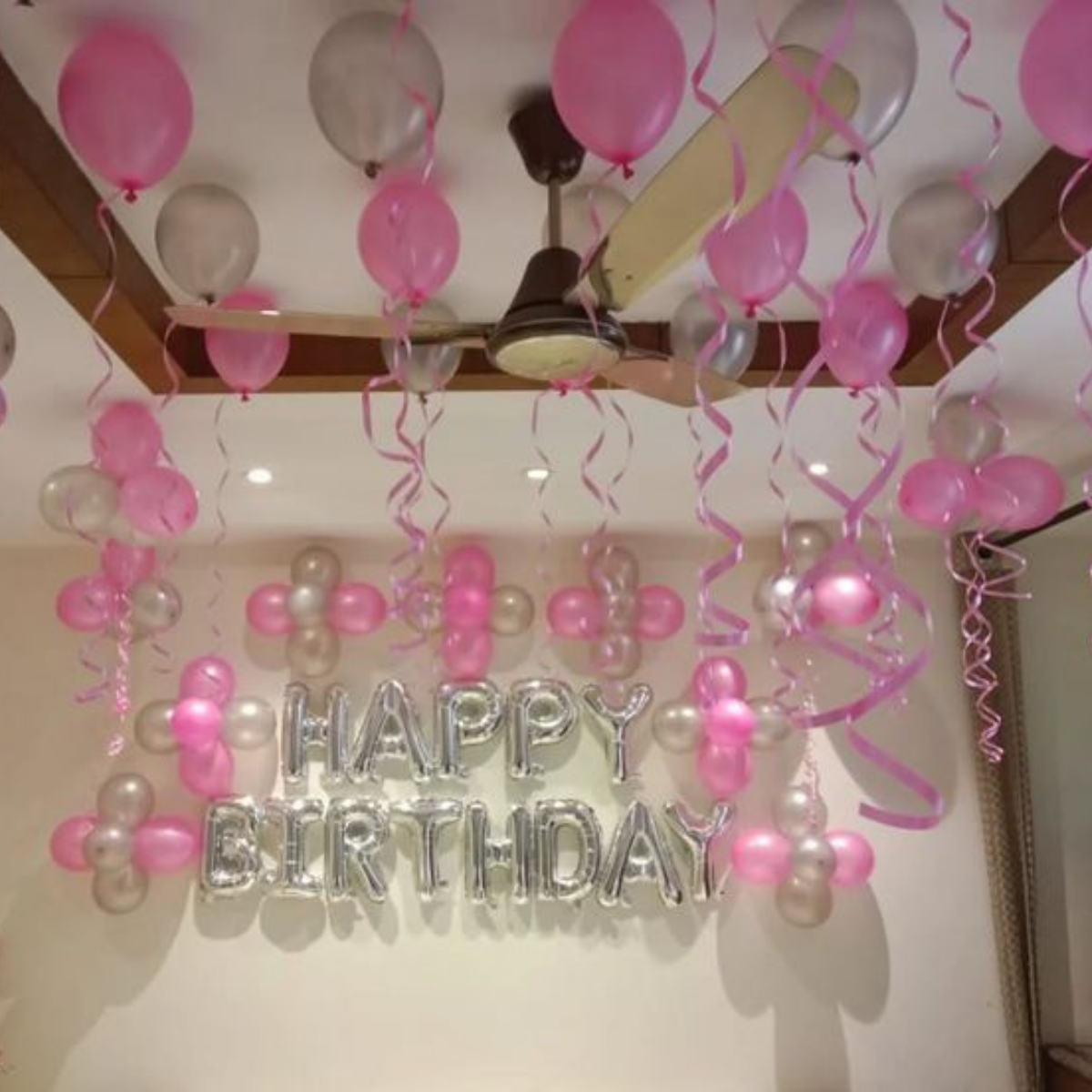 Make your celebration memorable with this elegant Pink & Silver Birthday Decoration Setup, perfect for homes, rooms, hotels, and surprise parties. The decor includes a mix of pastel pink and silver balloons arranged beautifully on the ceiling, curly ribbons hanging down for a festive touch, stylish balloon clusters on the wall, and shining silver HAPPY BIRTHDAY foil letters as the centerpiece.
