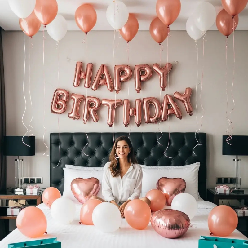 Elegant rose gold and white balloon setup for a birthday celebration — perfect for surprise room décor and photo-worthy moments.