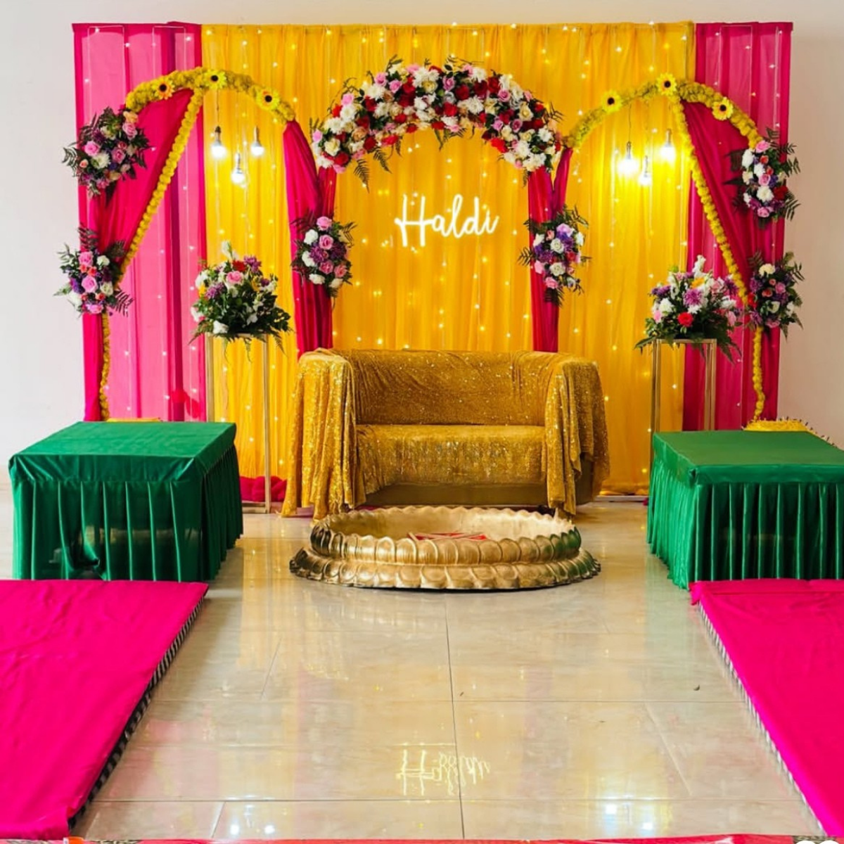 Create a vibrant and joyful wedding celebration with this traditional Haldi ceremony decoration. The setup features bright yellow and pink drapes, a beautiful floral arch backdrop, warm fairy lights, a stylish Haldi seating sofa, and a classic Haldi ritual tub. Perfect for home or venue Haldi functions, this décor adds a colorful, festive, and traditional touch to pre-wedding celebrations.